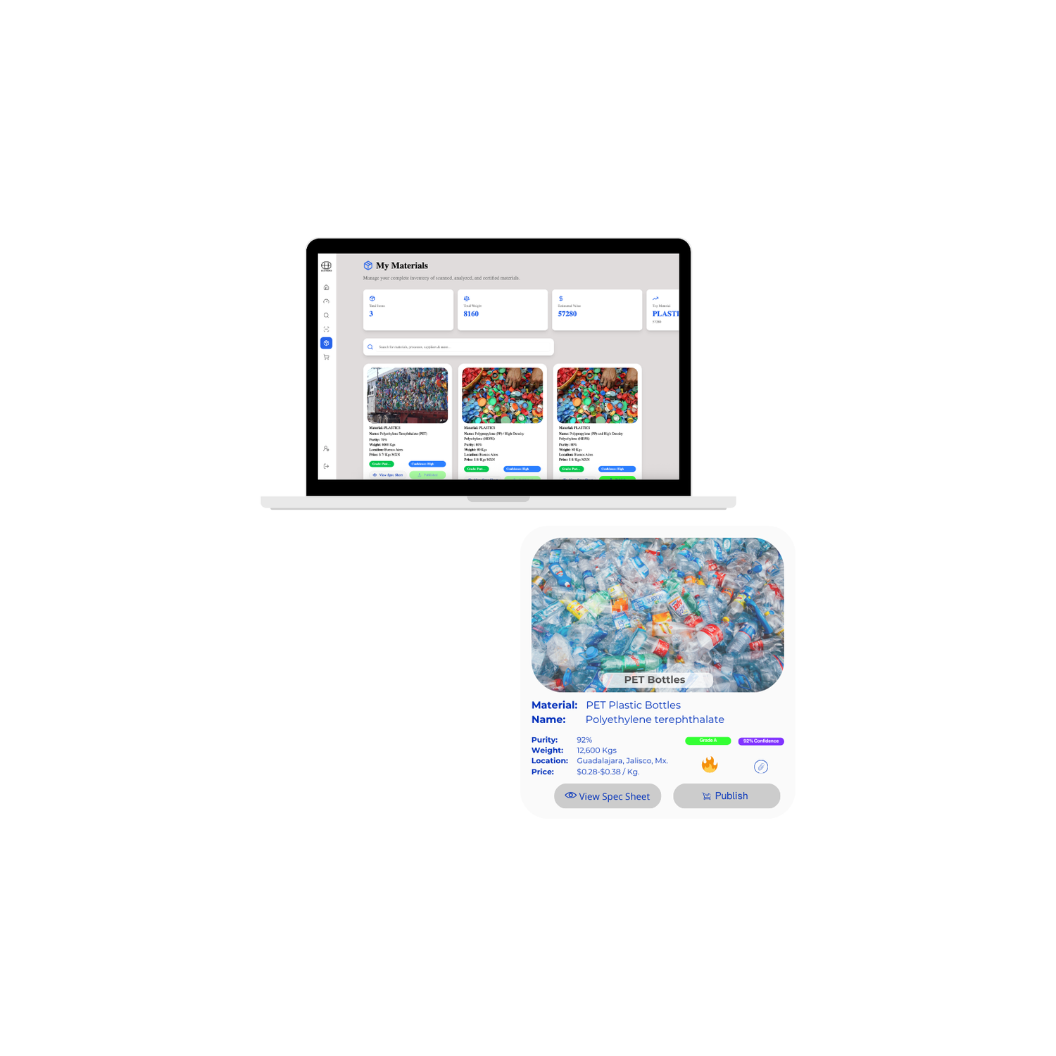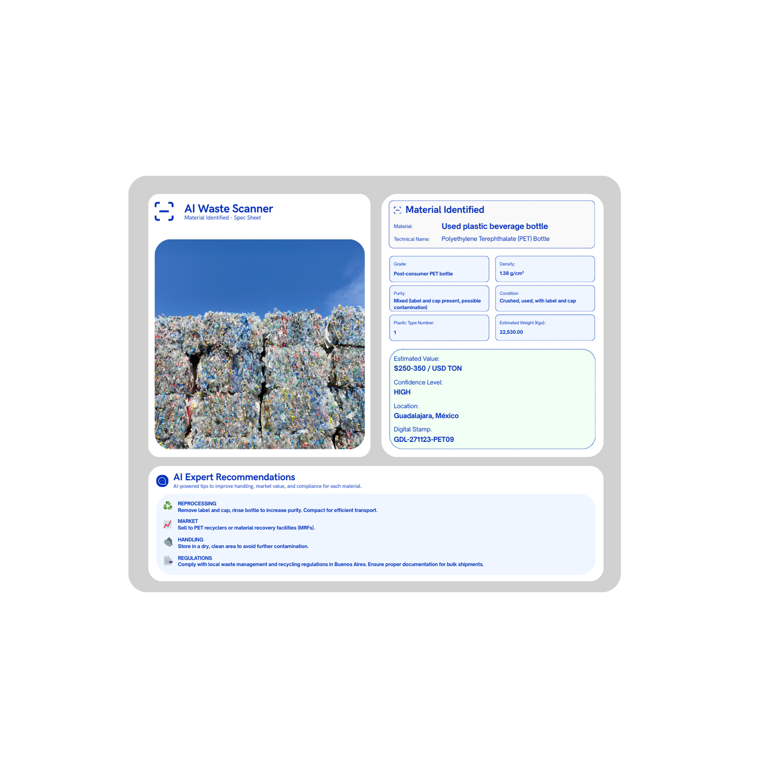 Con nuestro Escáner de IA y el módulo MyMaterials, las empresas pueden identificar al instante el tipo, la pureza, el peso y el valor estimado de cualquier residuo, generando fichas técnicas automatizadas y recomendaciones de cumplimiento normativo.