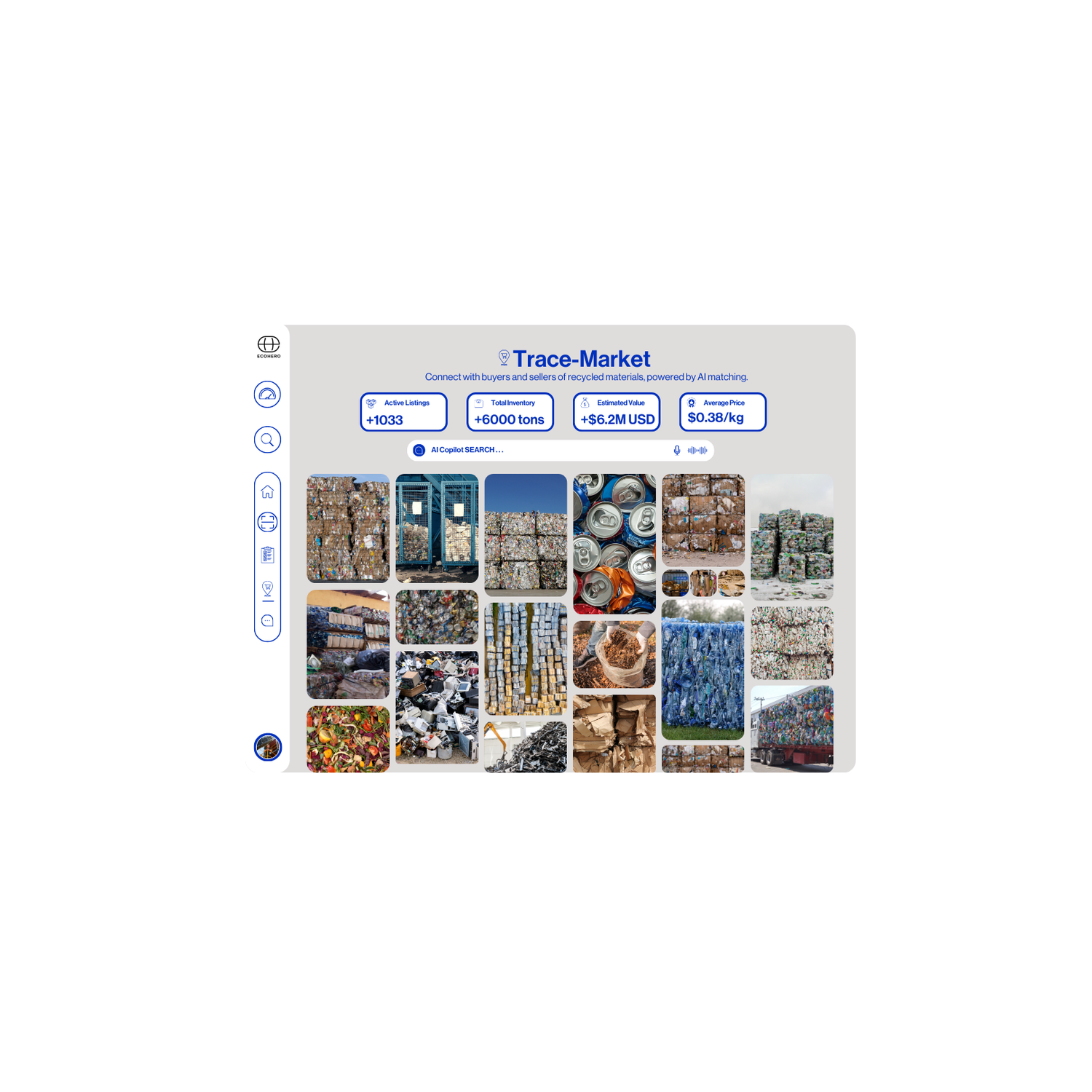 Nuestro Trace-Market permite a empresas verificadas comprar, vender o transferir materiales con total trazabilidad, especificaciones y certificaciones; digitalizando un mercado de $646 mil millones de dólares que actualmente se maneja de manera informal a través de Facebook y llamadas.